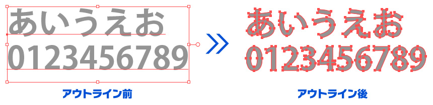 フォント情報が残ったままご入稿されると、お客様の意図しないフォントに置き換わって印刷されるケースがございますので、ご入稿いただくデータは必ずアウトライン化してください。