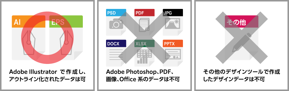 PowerPoint、Excel などの Office 系アプリケーションや、その他のデザインツールで制作したデータでの入稿は不可です。