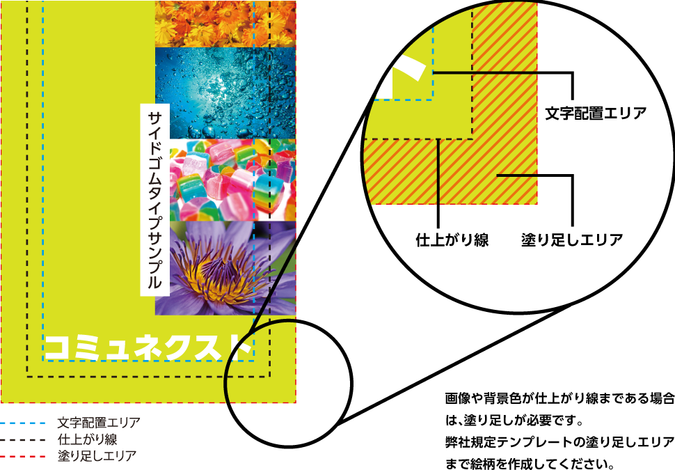 画像や背景色が仕上がり線まである場合は、塗り足しが必要です。弊社規定テンプレートの塗り足しエリアまで絵柄を作成してください。