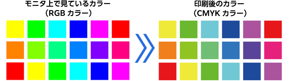 カラーモードがRGBカラーの場合、画面上と仕上がりとの色味が変わる場合がございます。
